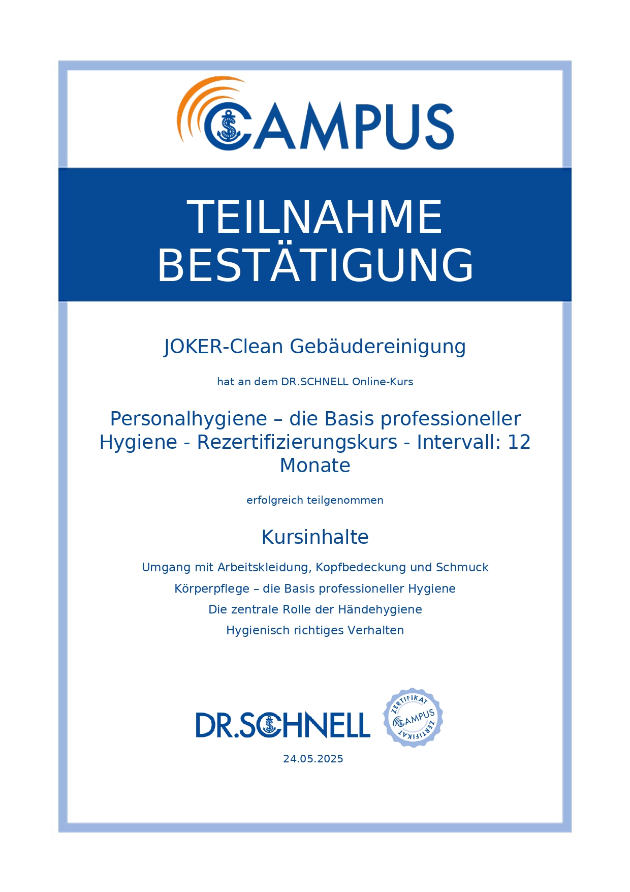 Verlässlichkeit, feste Ansprechpartner, transparente Abläufe und geschulte Teams. Bei JOKER-Clean legen wir genau darauf Wert – ohne leere Versprechen.